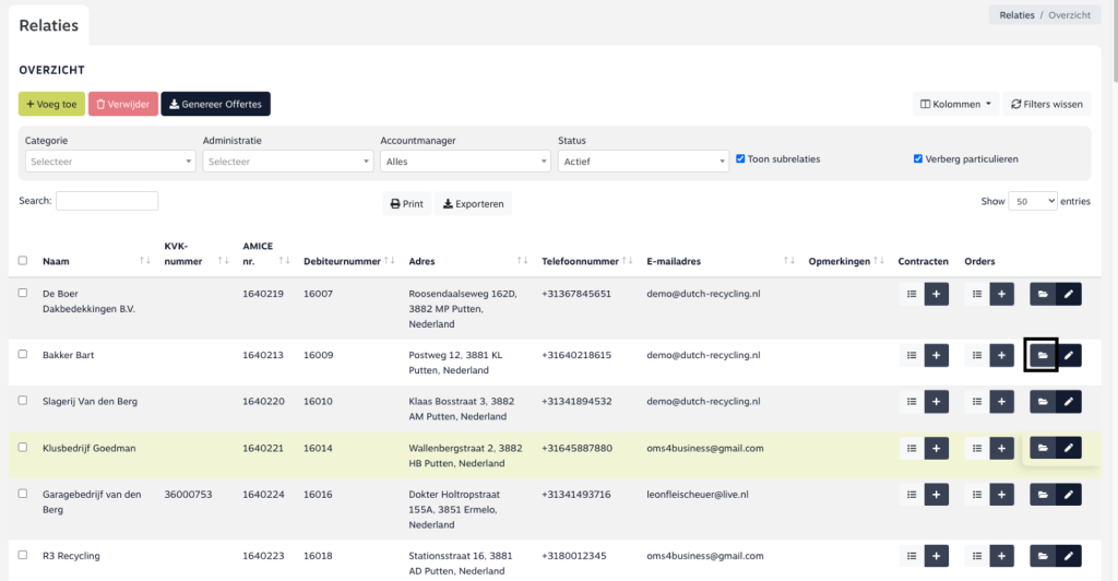 1. Ga in het hoofdmenu naar Relaties. Zoek de benodigde relatie en open de relatie door in de regelknoppen het mapje aan te klikken.