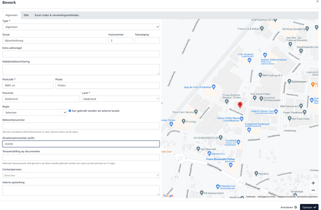 1. Vink daarna in de regel de optie ‘Kan gebruikt worden als externe locatie’ aan en sla het adres op. Let op:Vergeet niet het prefix van het afvalstroomnummer van de verwerker te registreren.