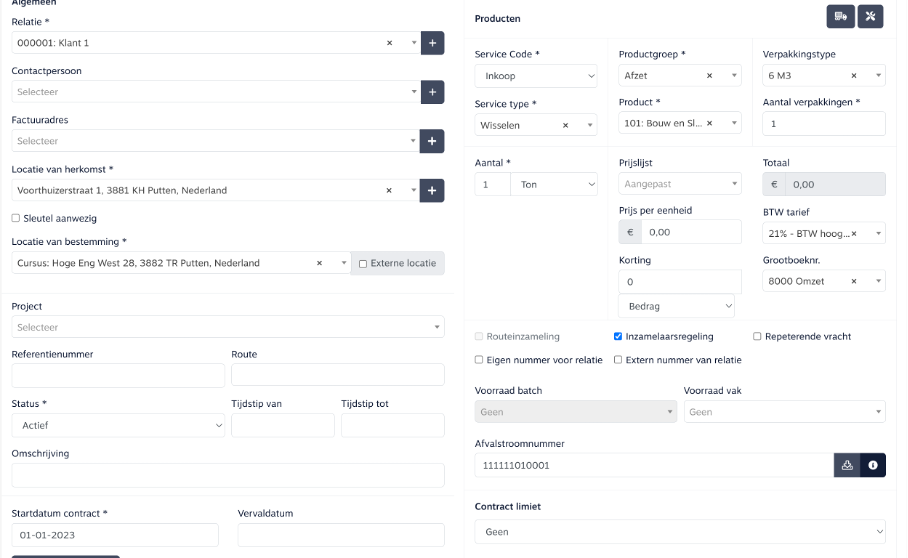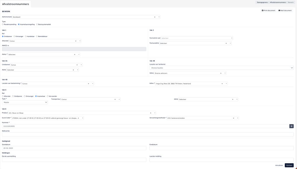 U ziet onder het kopje Administratie de optie Type staan. Het is van groot belang dat u de juiste type kiest. We hebben daarom in de handleiding een hoofdstuk ” Soorten Afvalstroomnummers” beschikbaar staan. Hierin staat duidelijk uitgelegd wanneer u de route-inzameling, de inzamelaarsregeling of de basissystematiek moet kiezen. Nadat u de juiste type heeft aangevinkt kunt u de overige gegevens invullen. Zorg dat er een correcte geldige startdatum is.