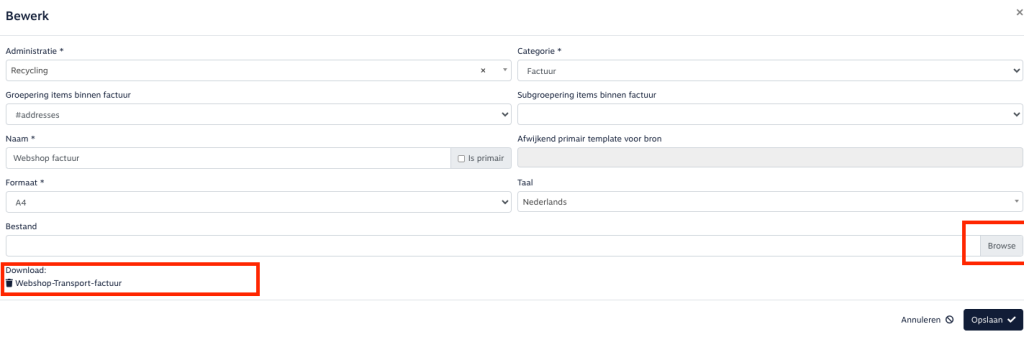 - Upload het gewijzigde bestand weer in OMS via de knop Bestand – Browse.