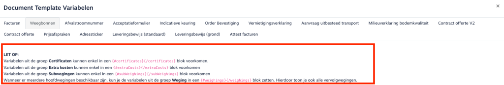 Let op bij blokvariabelen: Sommige variabelen behoren tot een groep, bijvoorbeeld Certificaten op het weegbontemplate. Deze moeten geplaatst worden tussen een blokstart en -einde, zoals: