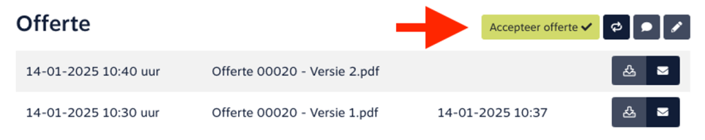 - De klant krijgt nu een e-mail met de offerte en kan deze digitaal ondertekenen met behulp van de button onder in de email. Zodra de klant de offerte heeft geaccepteerd zal de trajectstatus automatisch wijzigen van ‘Open’ naar ‘Accepted’. U kunt nu als opdrachtnemer de offerte eveneens accepteren. Door op de knop ‘Accepteer offerte’ te klikken in het sales traject.