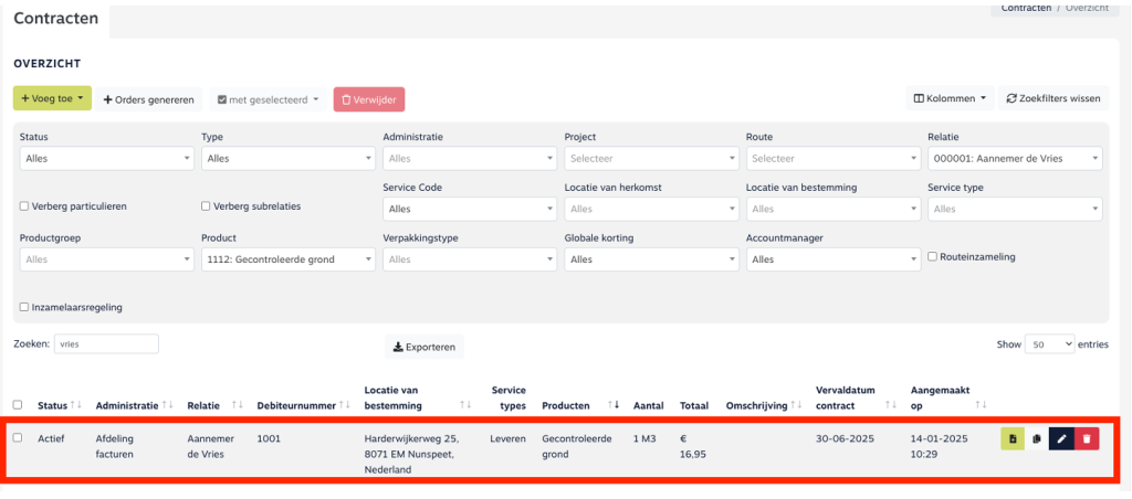 - De geaccepteerde offerte wordt nu automatisch toegevoegd aan het hoofdmenu ‘Contracten’, zodat vanaf dit scherm eenvoudig orders kunnen worden aangemaakt o.b.v. de overeengekomen offerte.