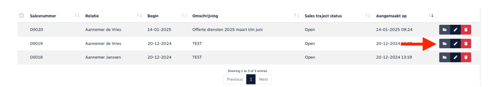 - Het zojuist aangemaakte salestraject staat nu in het overzicht. Hier kiest u voor het mapje: