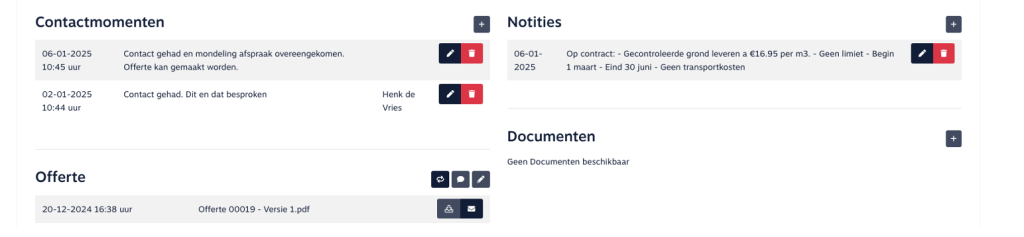 - In het traject kunt u contactmomenten, notities toevoegen. Hierdoor houdt u overzicht op gemaakte afspraken en besproken onderwerpen om de offerte goed op maat te kunnen maken. Daarnaast kunt u aanvullende documenten toevoegen die meegestuurd moeten worden met de offerte. Dit alles doet u door op de ‘+’ te klikken.