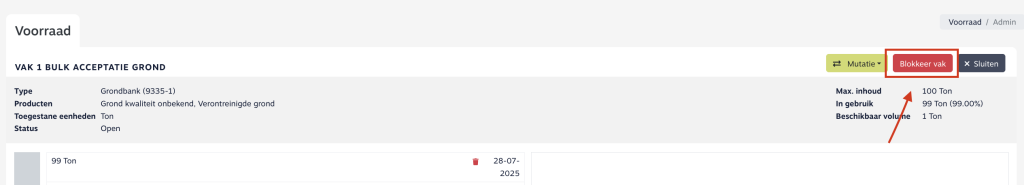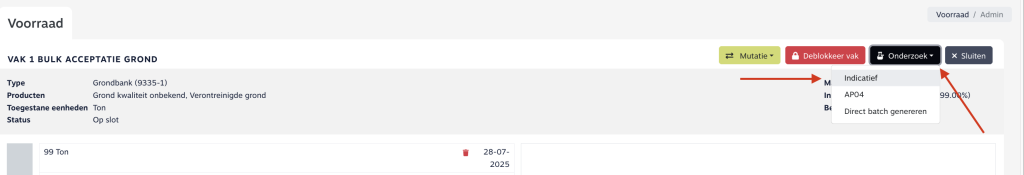 Zodra het bulkvak vol zit, of evt. al op een eerder gewenst moment kan een indicatieve keuring worden uitgevoerd. Als het vak vol zit blokkeert het vak automatisch. Wilt u dit eerder doen, kies dan voor de blokkeer knop.