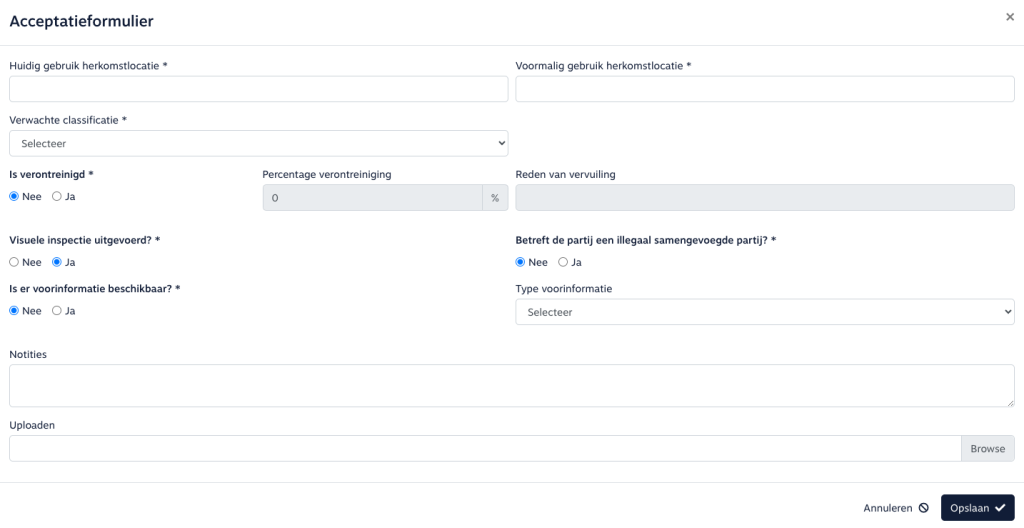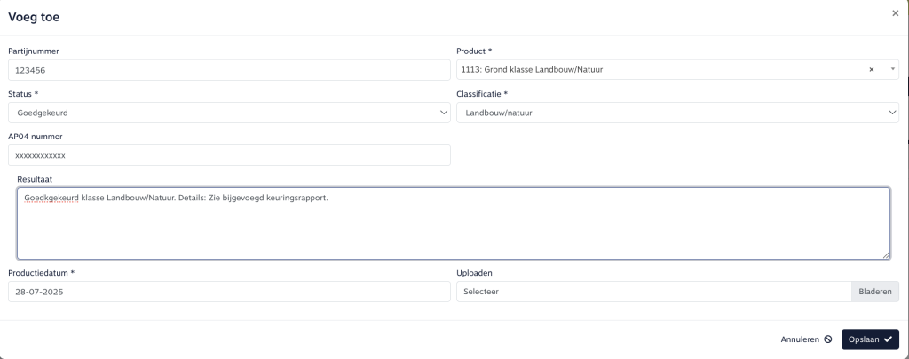 Vul het formulier in a.d.h.v. het keuringsrapport en sla dit op. Het EKV document voor deze batch is nu ingevuld.