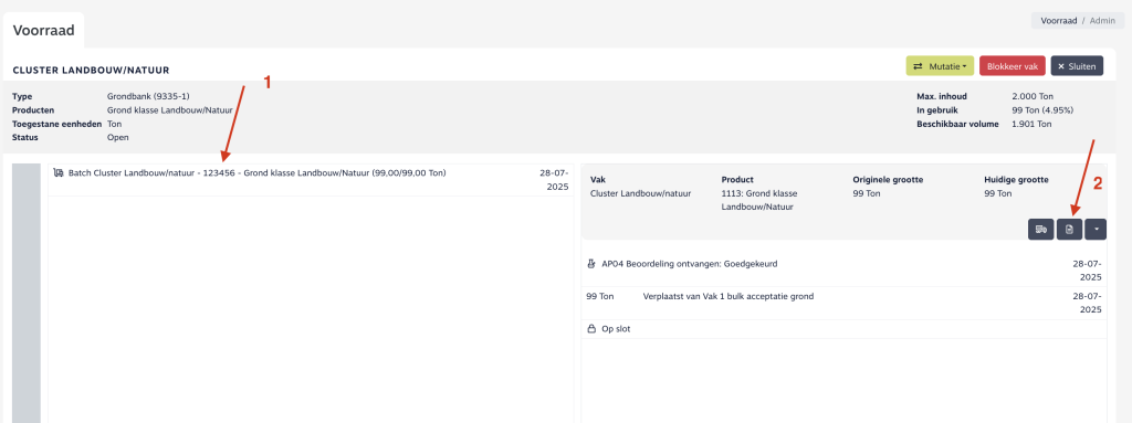2: Clustervakken: Dit zijn de 2000 tons voorraadvakken waar de reeds indicatief gekeurde grond naartoe wordt verplaatst om daar vervolgens een AP04 keuring uit te voeren. Hierna is de batch verkoopbaar.