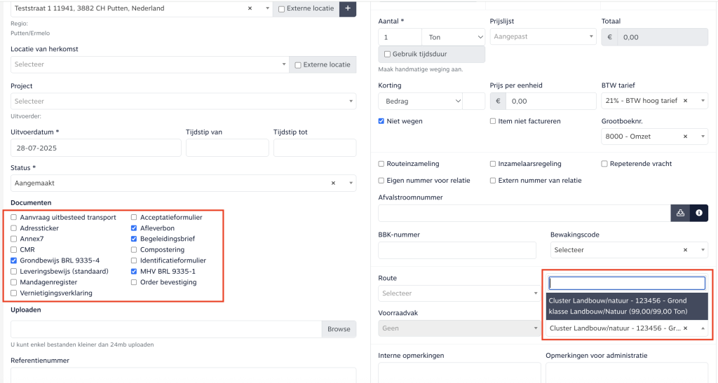 In de order bij Documenten kunt u het Acceptatieformulier aanvinken. Door dit aan te vinken verschijnt het onderstaande veld. Vul dit in het sla vervolgens de order op.