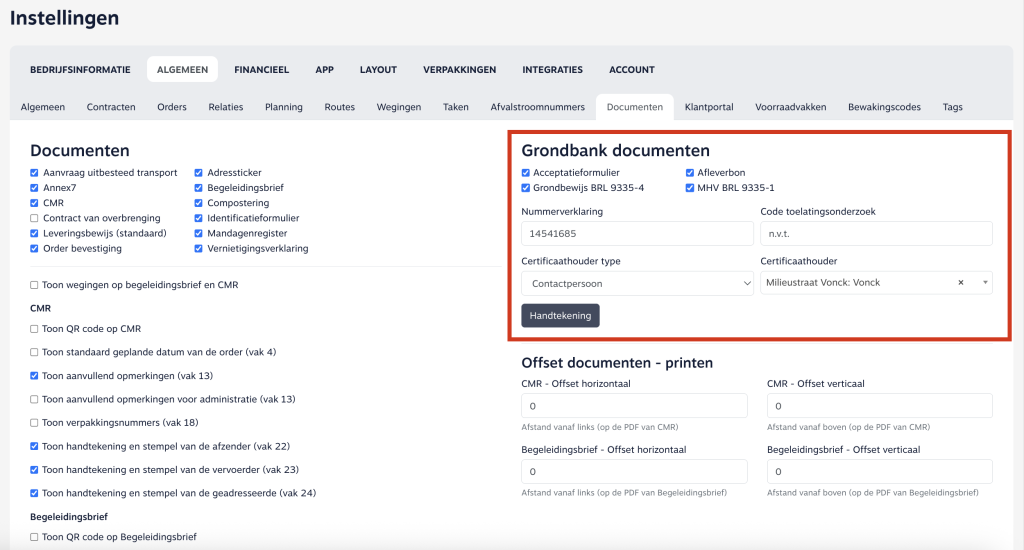 Om de grondbank module goed te kunnen toepassen, is het belangrijk dat in het algemene menu de juiste instellingen zijn toegepast. Deze zijn te vinden via het tandwieltje bovenin beeld. Vervolgens navigeert u naar het sub tabblad ‘Documenten’. Hier vult u de velden aan de rechterkant zo volledig mogelijk in.