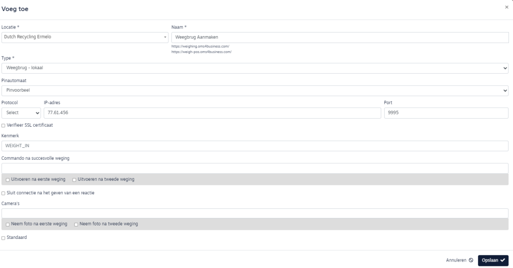 Let op: Dat waneer het IP-adres van de weegcomputer wijzigt, dit ook bij de betreffende weegbrug opnieuw ingesteld dient te worden. Dit kan door op het icoontje “wijzigen” achter de weegbrug te klikken.