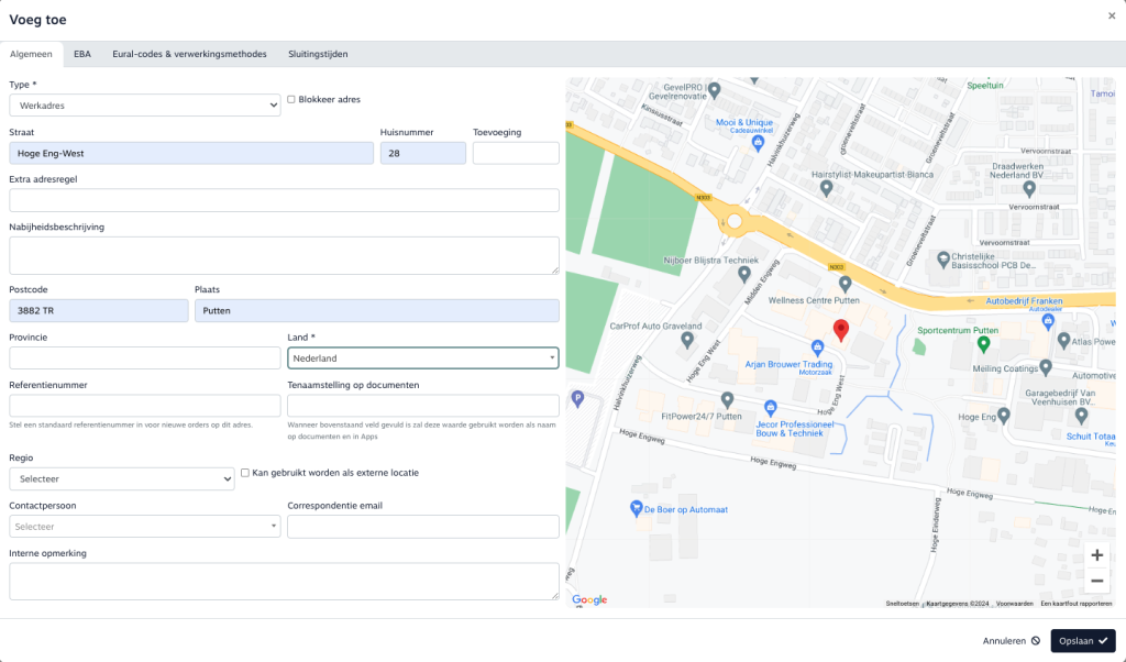 Een werkadres kan aangemaakt worden via het hoofdmenu Relaties. Zoek de relatie waar u een werkadres aan toe wil voegen. Open via het mapje op de regelknoppen de relatiekaart. Ga naar de tab Adressen. U kunt nu een werkadres toevoegen door op de knop “Voeg toe” te klikken. In het verschenen scherm kunt u alle benodigde informatie toevoegen. U kunt hier ook aangeven of het adres als externe relatie kan worden gebruikt.
