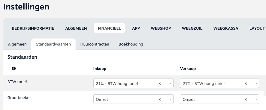 Via het submenu Instellingen tabblad Financieel –Standaardwaarden kunt u een standaard grootboeknummer invullen. Hierop zal OMS terugvallen indien ervoor producten op contracten geen specifieke grootboeknummers zijn ingevoerd.