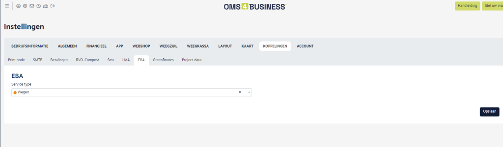Om dit mogelijk te maken zal er eerst een servicetype toegewezen moeten worden voor de EBA-vooraanmeldingen. Dit kan via het submenu Instellingen kies vervolgens de categorie Integraties – EBA.