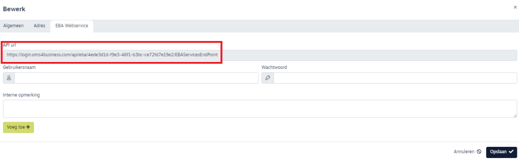 Vervolgens kan het End-point opgezocht worden via het hoofdmenu Stamgegevens – Inventaris – Eigen Locaties. Open de desbetreffende locatie via het potloodje op de regelknoppen. Ga daarna naar de categorie EBA Webservice. Dit End-point wordt automatisch aangemaakt bij het opslaan van een “eigen locatie”. Bij een al bestaande locatie zal deze dan ook al vermeld staan.
