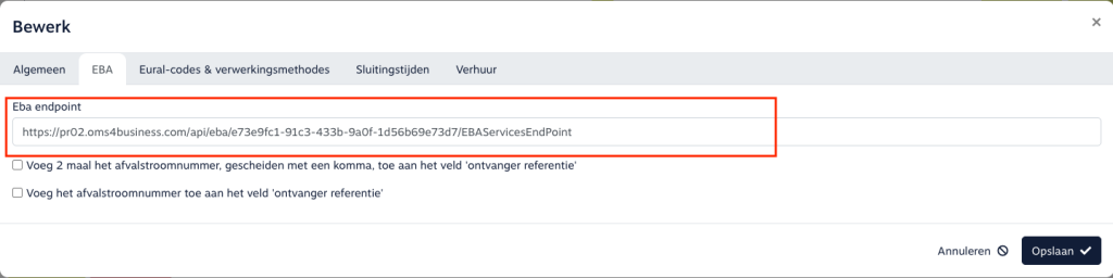 Vervolgens kan het End-point opgezocht worden via het hoofdmenu Stamgegevens – Inventaris – Eigen Locaties. Open de desbetreffende locatie via het potloodje op de regelknoppen. Ga daarna naar de categorie EBA Webservice. Dit End-point wordt automatisch aangemaakt bij het opslaan van een “eigen locatie”. Bij een al bestaande locatie zal deze dan ook al vermeld staan.