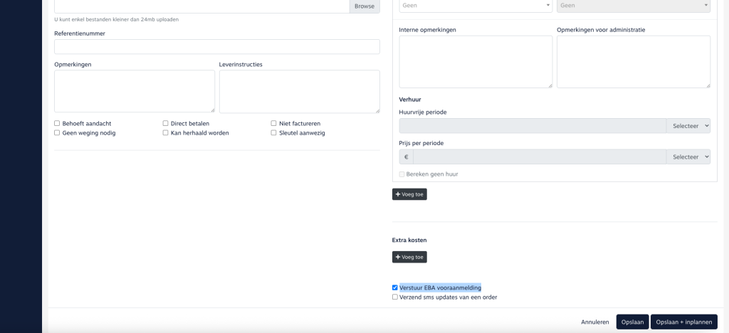 Om de EBA vervolgens te gebruiken op een order is het belangrijk dat onderaan het orderscherm het vinkje ‘Verstuur EBA vooraanmelding’ wordt aangezet.