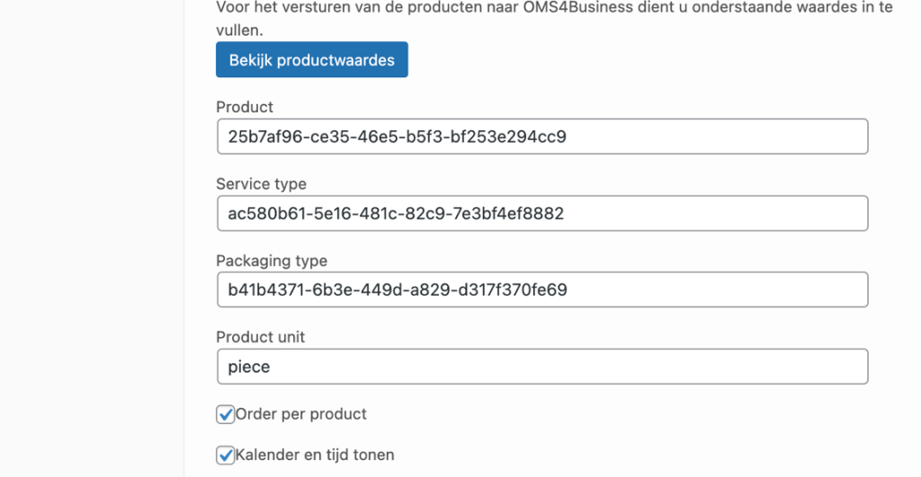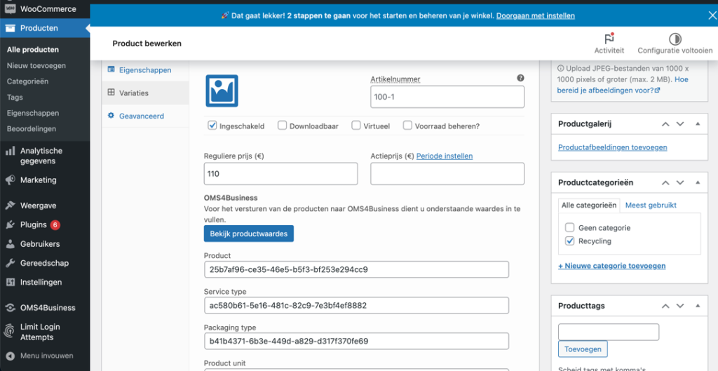 Binnen de Woocommerce shop kunt u producten maken. Bij de producten eigenschappen kan mij Variaties een eenmalige mapping gemaakt worden van kenmerken met OMS. Door op de knop Bekijkproductwaardes te drukken opent er een pagina die de gegevens ophaalt vanuit OMS. Deze kunnen in de corresponderende velden worden overgenomen (Kopiëren en Plakken).