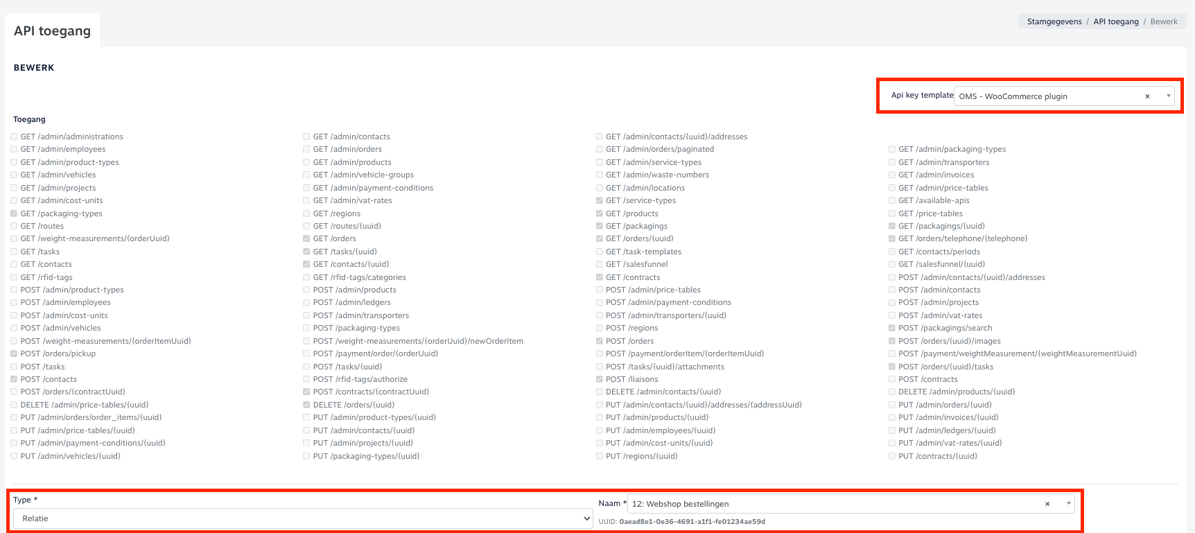 4. De rechten van deze API zijn van het type Relatie en zijn als volgt ingesteld in OMS.