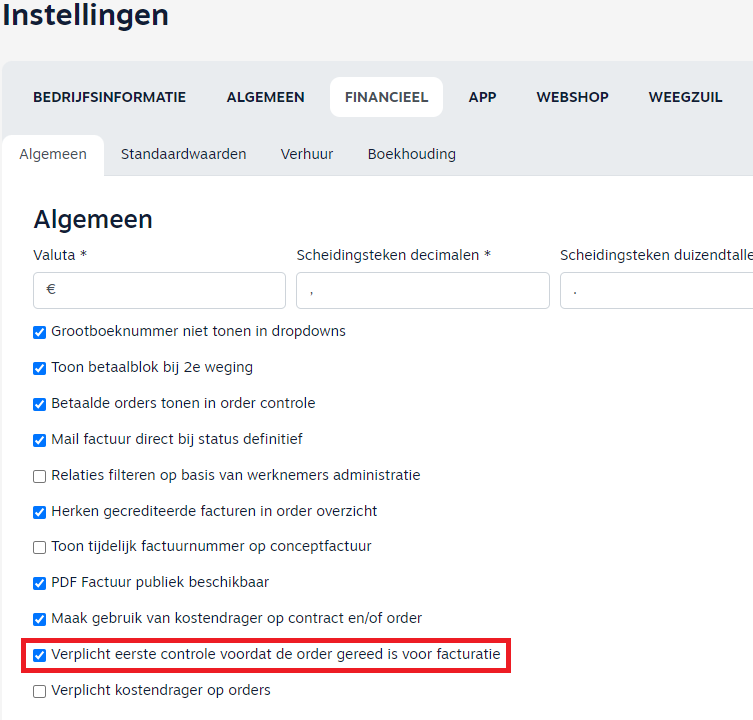 Dit kan ingesteld worden door via het submenu Instellingen – Financieel een vinkje aan te zetten bij “Verplicht eerste controle voordat order gereed is voor facturatie”.