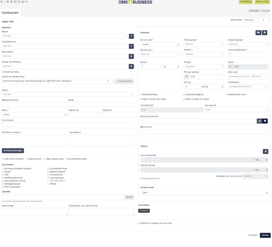 In de rechterkolom staan de gegevens m.b.t. de producten en prijzen. Daarnaast kunt u in deze kolom ook diverse documenten aanmaken die horen bij dit specifieke contract. Zet hiervoor onderaan de vinkjes aan van de benodigde documenten.