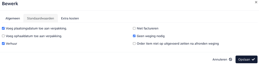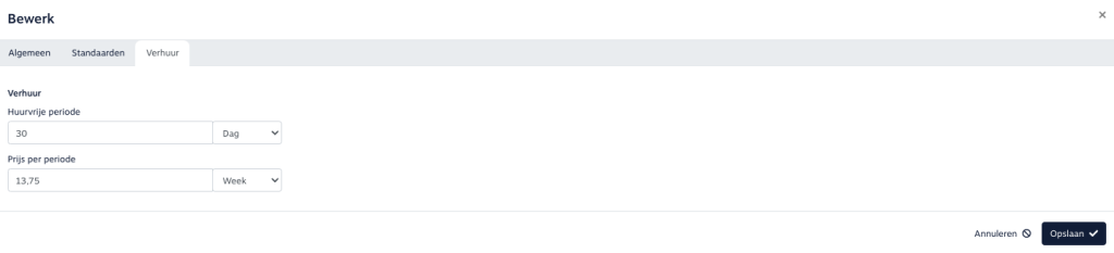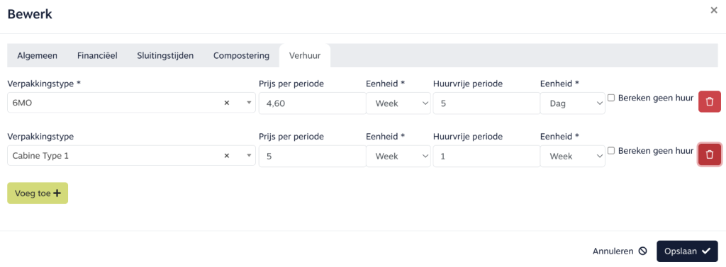 Per verpakkingstype geeft u aan in het tabblad verhuur, wat de default regelingen zijn per type m.b.t de vrije periode en de prijs per periode.