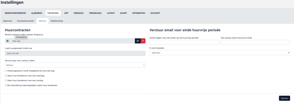 Via het submenu Instellingen – Financieel – verhuur kunt u instellen wanneer OMS de huurorder moet aanmaken, met welke frequentie en het servicetype. OMS zal automatisch ’s nachts de order maken en deze meteen op uitgevoerd zetten zodat deze bij de order controle naar voren komt.