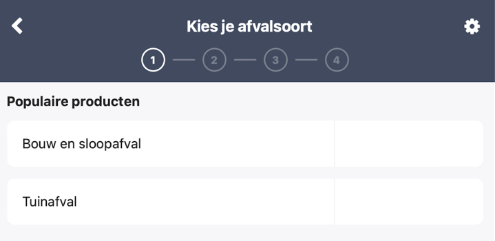 Na het kiezen van de “wissel” of “ophaal” knop (of bij plaatsen van een nieuwe order), geeft de Relatie aan om welk soort afval het gaat dat in de verpakking zit (of gaat komen). Na het selecteren drukt hij op de knop “volgende”. Hierna volgt een scherm met een kalender waar hij de gewenste uitvoerdatum en tijden kan invoeren. In het volgende scherm kan hij eventueel een foto maken (bv waar de verpakking moet staan) en toevoegen. Tot slot volgt er een samenvatting en kan de order geplaats worden. De Relatie ontvang hiervan een bevestiging.