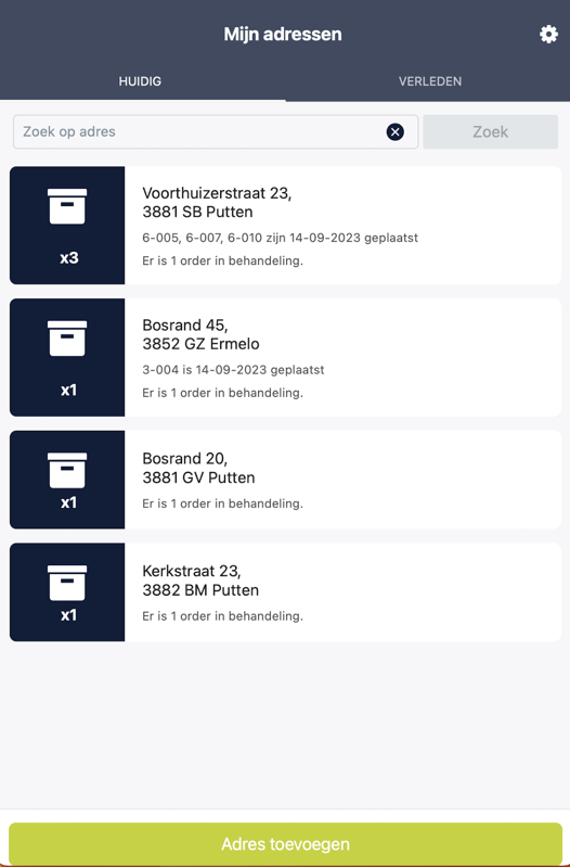 Als de relatie inlogt dan komt hij op een pagina in de app waar hij een overzicht heeft van “huidige” en “verleden” adressen. Dit zijn adressen waar verpakkingen staan of gestaan hebben. Vanuit dit scherm kan ook een adres gezocht worden en een nieuw adres kan worden aangemaakt.