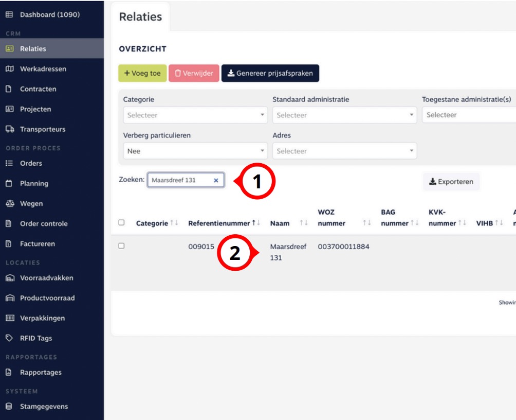 - Ga via het hoofdmenu naar Relaties. Gebruik de zoekbalk om de gewenste relatie te vinden op basis van adres of postcode.