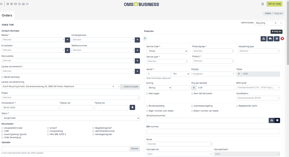- Daarnaast is het mogelijk om vanuit het hoofdmenu Orders een order aan te maken. Klik op de knop ‘Voeg toe’ u kunt nu de order aanmaken.