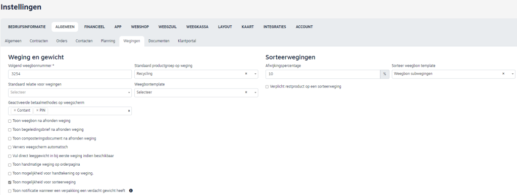Om de functionaliteiten te gebruiken, moet deze eerst worden geactiveerd via Instellingen – Algemeen – wegingen. Dit kan gedaan worden door een vinkje te zetten bij “toon mogelijkheid voor sorteerweging”. Onder het kopje sorteerwegingen kan een toegestaan afwijkingspercentage, een standaard weegbon template en een verplichting tot een restproduct worden aangegeven