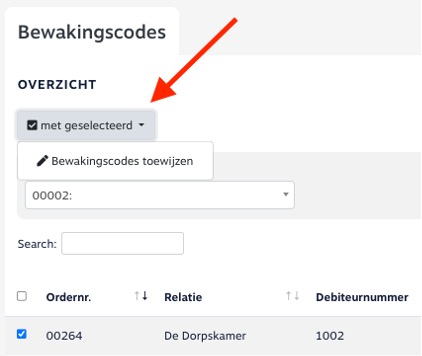 - Wanneer meerdere orders dezelfde bewakingscode moeten krijgen, kan dat in 1 keer door alle orders te selecteren en bovenaan op ‘met geselecteerd’ te klikken