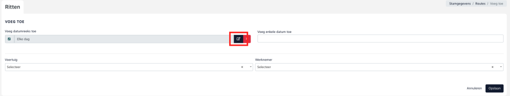 Indien u de frequentie heeft ingevuld dat geeft u een start- én einddatum* in. Kies vervolgens het voertuig en de werknemer.