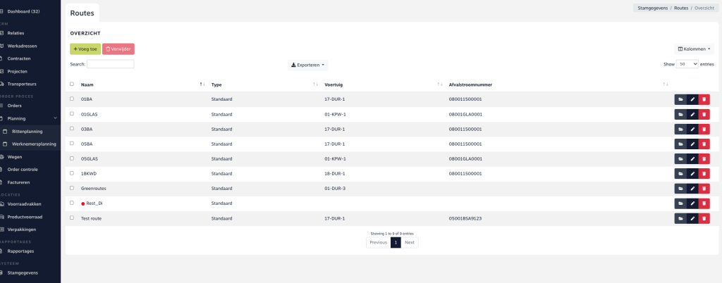 Mocht u geen gebruik maken van één van onze koppelingen betreffende route optimalisatie dan is het mogelijk om in bulk handmatig de route(s) aan te passen. Ga via het hoofdmenu naar Stamgegevens – Transport – Routes. Zoek de benodigde route en open deze via de regelknoppen. Start met het exporteren van de gegevens en selecteer alle velden. Let op dat u bij Type kiest voor CSV. U kunt nu de export uitvoeren.