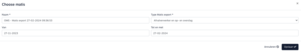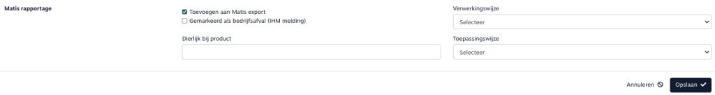 - Afvalverwerker en op- en overslag: alle in- en verkooporders met een eigen locaties in de opgegeven periode, met producten welke de optie ‘Toevoegen aan Matis export’ geactiveerd hebben.