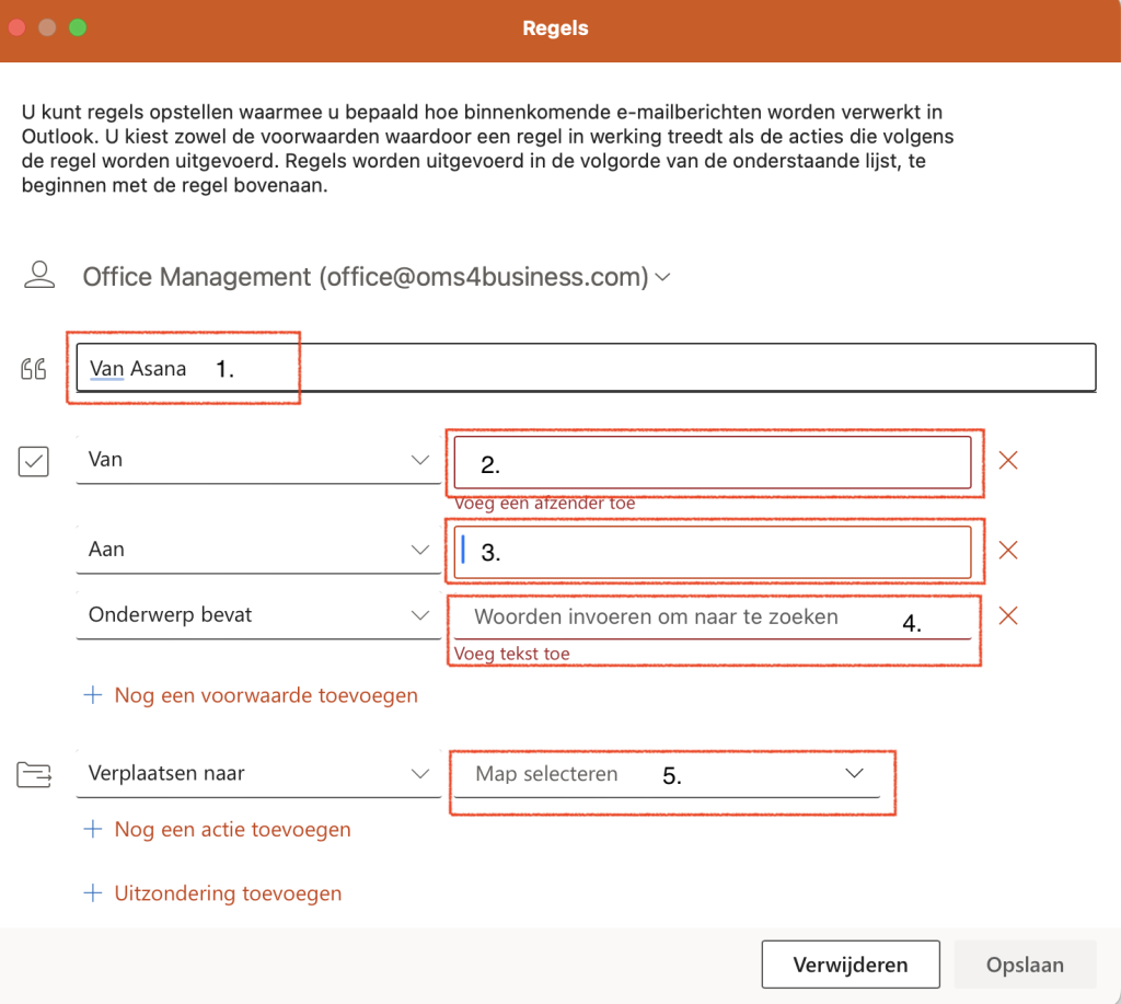 Mocht u wel alle e-mailberichten van Asana willen ontvangen (U maakt dan géén gebruik van de bovenstaande optie). Dan kunt u deze e-mail berichten ook laten binnenkomen in een daarvoor bestemde map in Outlook.