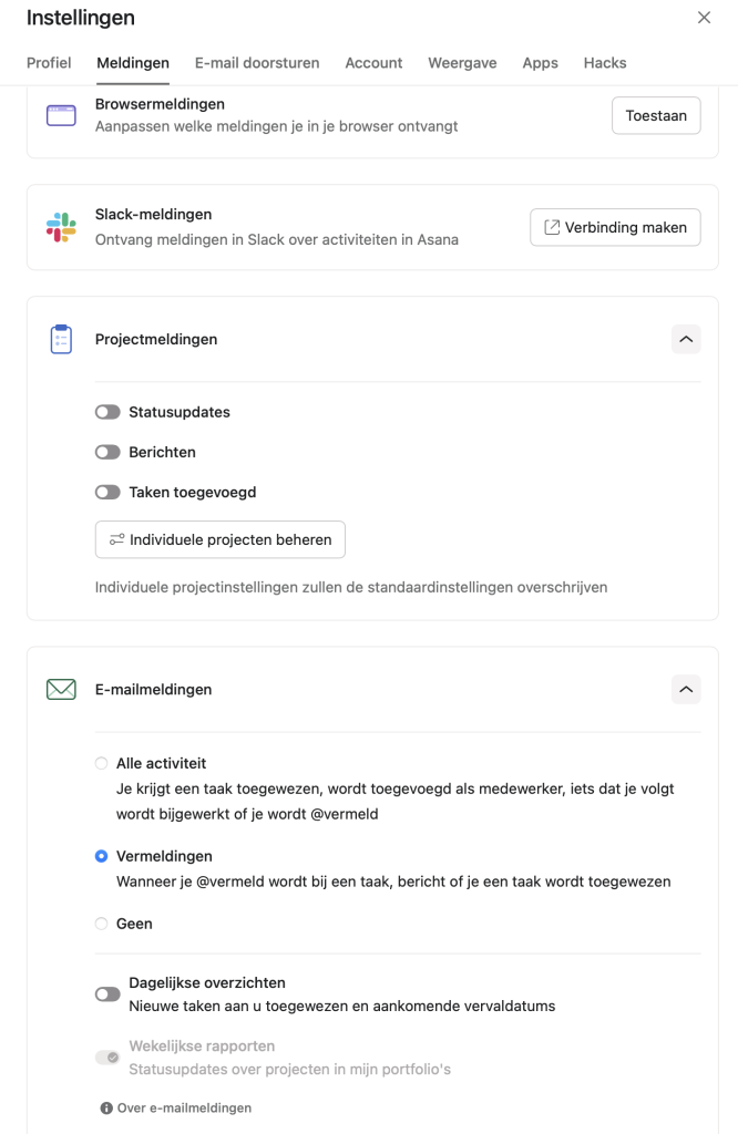 Nu staan er standaard meerdere vinkjes aan wat betreft e-mailberichten die u ontvangt vanuit Asana. U kunt via Instellingen in Asana naar het tabblad Meldingen gaan om deze e-mailmeldingen te beheren. Hieronder ziet u Projectmeldingen en E-mailmeldingen. U kunt de meldingen op projectmeldingen helemaal uitzetten. Wat betreft de e-mailmeldingen adviseren wij het vinkje ” Alleen vermeldingen” aan te laten staan. Dit om te zorgen dat u de reactie van onze Support afdeling op uw eigen ticket niet mist.